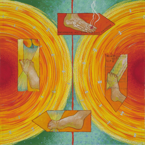 With “Re-Attuning to Life, ” I was the individual in need of change; I had painful inflammation in a few toe joints, limiting mobility.  A medical intuitive saw an image of my foot giving off smoke (“releasing poison”).  I realized the “poison” was actually a limiting belief that was crippling me.  I began my practice sessions with a Continuum dive by focusing jocks and theta breaths into my toes.  I enjoyed the return of movement and nuanced sensation to the afflicted area.  By continuing to work with the breath, I would then re-attune with life, joy, possibility, enthusiasm, passion, love, prosperity and compassion.  On the inhalation, I received each quality and on the exhalation, I shared it.  I saw/felt these qualities as a vibration depicted in the painting as concentric circles of yellow, orange and red.  After spending a few months doing interactive sessions with the painting, today, my foot is healed.